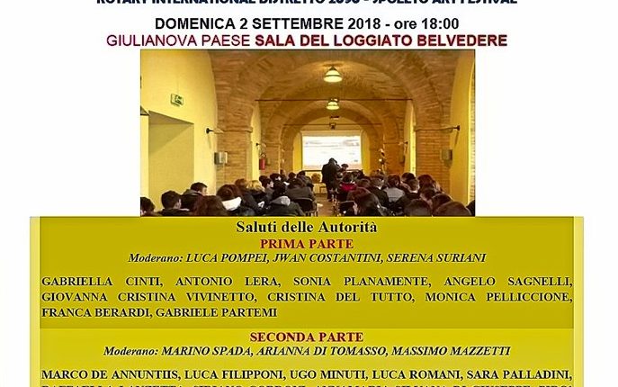 Redazione-GRANDE APPUNTAMENTO con la cultura DOMENICA 2 SETTEMBRE 2018 alle ore 18 a GIULIANOVA PAESE presso la Sala del LOGGIATO BELVEDERE di Giulianova, Piazza Belvedere con IL FESTIVAL AGAPE CAFFÈ LETTERARI D’ITALIA E D’EUROPA – ROTARY INTERNATIONAL DISTRETTO 2090 – SPOLETO ART FESTIVAL, organizzato dai Rotary Club Teramo Est (Capofila) Teramo Nord Centenario, Teramo. Il Rettore Università degli Studi di Teramo DINO MASTROCOLA, il Governatore del Distretto Rotary 2090 GABRIO FILONZI ed il ViceSindaco di Giulianova NAUSICA CAMELI conferiranno agli Ospiti le Pergamene del PREMIO ROTARY AGAPE 2018 PER LA CULTURA (alla prima edizione assoluta) a personaggi del mondo della cultura e del giornalismo e del Rotary, che si sono distinti per la cultura particolarmente negli ultimi anni ed in particolare nell’ultimo anno.