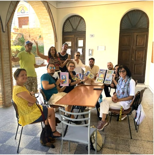 Redazione- Ringrazio sentitamente Stella Chiavaroli per questo vivace scatto con cui ha immortalato me e tutti i presenti allo stimolante incontro, tenutosi a Silvi nell’ambito dei “Laboratori Sociali Inclusivi”. Una scena che porterò sempre nel cuore con grande orgoglio: tutti con i miei segnalibri in mano, io che mostro anche quello raffigurante il famoso gatto nero col fiocco rosso, accompagnato sul retro dalla mia poesia “Spirito felino”, un inno a vivere con vibrante pienezza la vita.