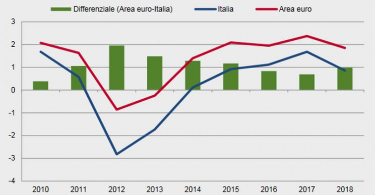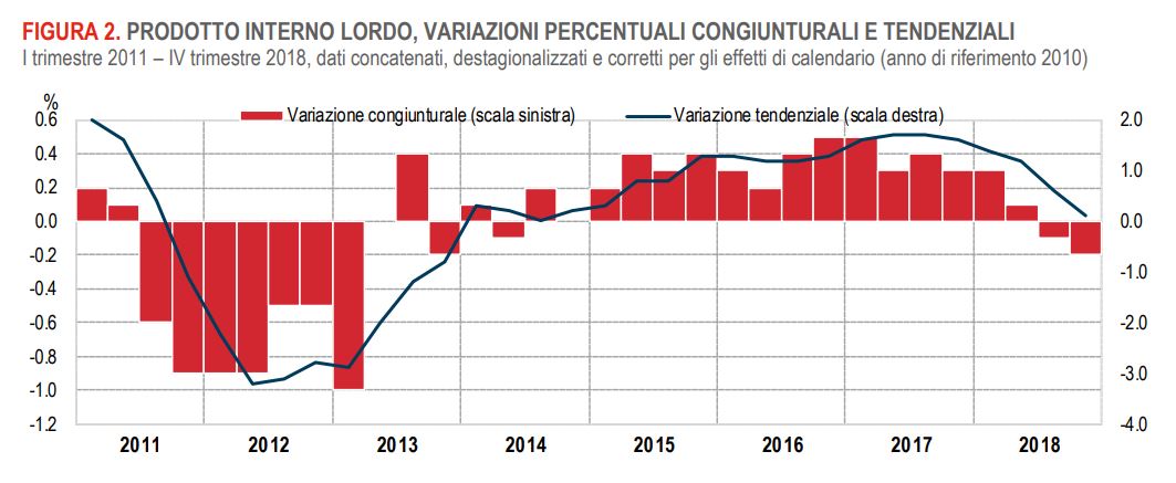 Già nel quarto trimestre del 2018 l’economia italiana ha segnato una consistente contrazione, che faceva seguito a quella, più modesta, registrata nel terzo trimestre dello stesso anno. Tale risultato negativo ha determinato un ulteriore abbassamento del tasso di crescita tendenziale del Pil, che è sceso allo 0,1%, dallo 0,6% del trimestre precedente che poi è continuato a decrescere nel 2019 andando alla deriva nel 2020 con la pandemia manifestatasi a livello mondiale a partire dalla Cina a fine dell’anno 2019.