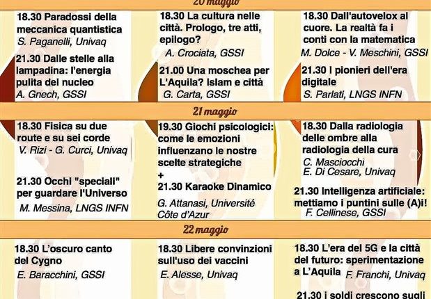 Durante ognuna delle tre serate, avremo l’opportunità di partecipare a due eventi per ognuno dei tre locali del centro storico aquilano – I Due Magi (Piazza Duomo), Fratelli Il Bacaro (Via Roio) ed Enoteca Quattro Quarti (Corso Federico II) – in tutto 18 eventi condensati in tre giorni in cui si potrà parlare di scienza con ricercatori e scienziati, in un’atmosfera informale.