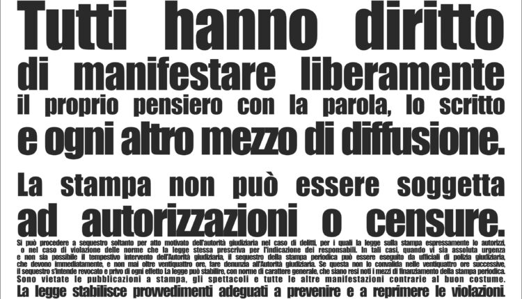 Dice l’art. 21 della Costituzione italiana :«Tutti hanno diritto di manifestare liberamente il proprio pensiero con la parola, lo scritto e ogni altro mezzo di diffusione. La stampa non può essere soggetta ad autorizzazioni o censure».