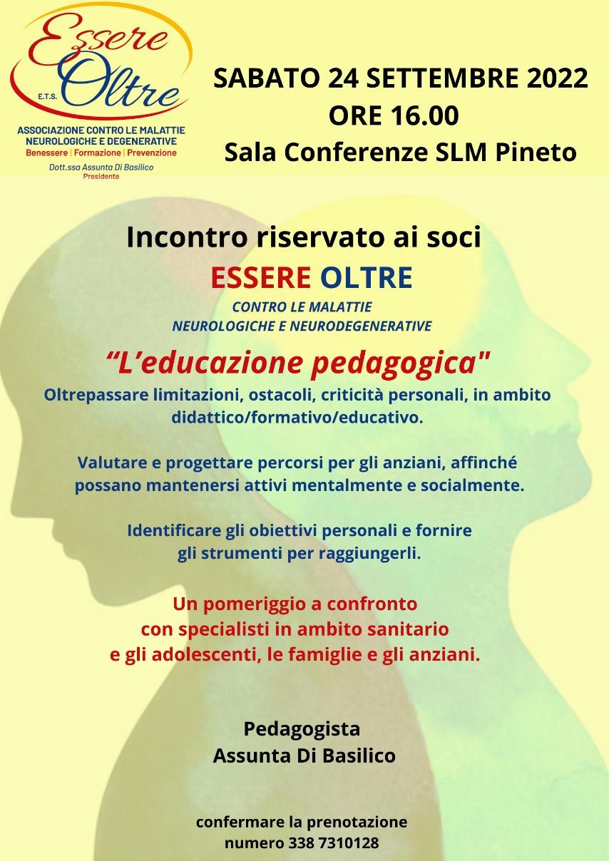 Redazione- Sabato 24 settembre 2022 si è conclusa nella Sala Conferenze SLM a Pineto, l’incontro sull’Educazione Pedagogica con gli esperti Psicopedagogisti, insieme ai soci Essere Oltre.