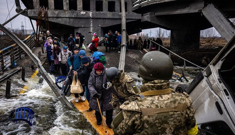 *la foto è attribuita sul web a Dimitar Dilkoff, fotografo di A-PF con questa dicitura Gli sfollati attraversano un ponte distrutto mentre fuggono dalla città di Irpin, a nord-ovest di Kiev. 7 marzo 2022 Dimitar Dilkoff/AFP