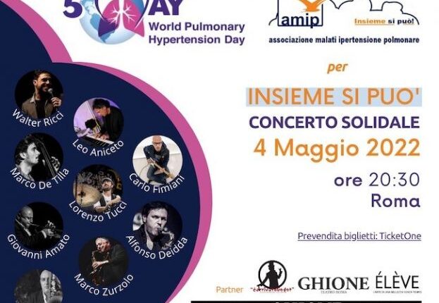 Redazione- “Insieme si può” è il titolo della serata jazz che l’A.M.I.P. (Associazione Malati di Ipertensione Polmonare) e e Ass. Èarrivatogodot hanno organizzato per l’annuale World Pulmonary Hypertension Day che si svolgerà il 4 maggio presso il Teatro Ghione di Roma (inizio ore 21:30 ingresso al botteghino 15 euro).