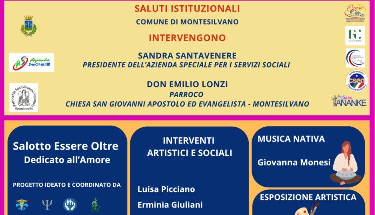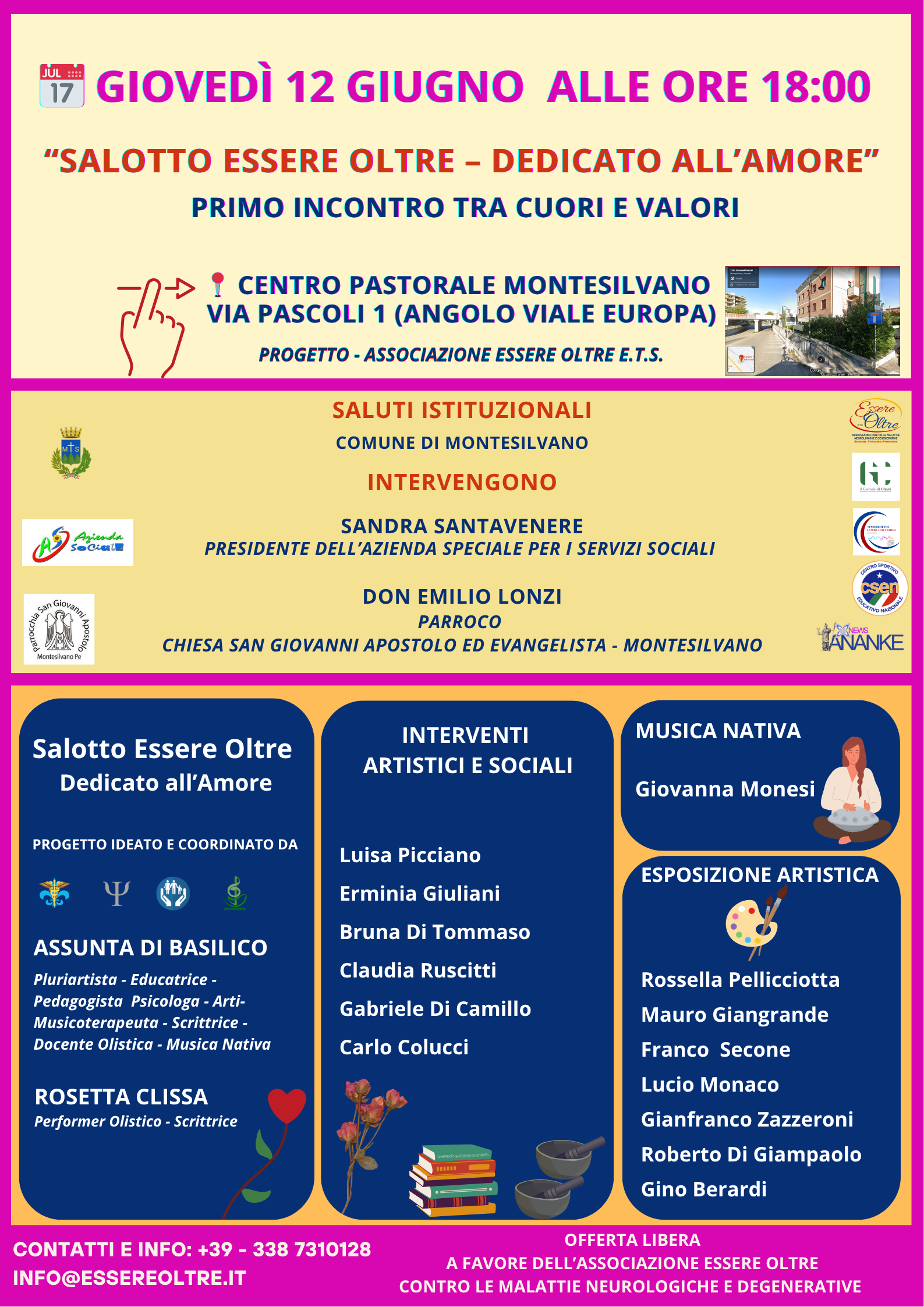 L’evento, promosso dall’Associazione Essere Oltre ETS, è ideato e coordinato dalla Dott.ssa Assunta Di Basilico – psicologa, pedagogista, musicoterapeuta, educatrice olistica e pluriartista – in collaborazione con Don Emilio Lonzi, Parroco della Chiesa San Giovanni Apostolo ed Evangelista di Montesilvano, e con il patrocinio della Presidente dell’Azienda Speciale per i Servizi Sociali, Sandra Santavenere.