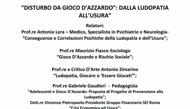 UNIVERSITA’ DELL’AQUILA, CONVEGNO DI ALTO PROFILO SU: “DISTURBO DA GIOCO D’AZZARDO- DALLA LUDOPATIA ALL’USURA”(IN RICORDO DEL PROF.RE GIUSEPPE CRISTOFARO)